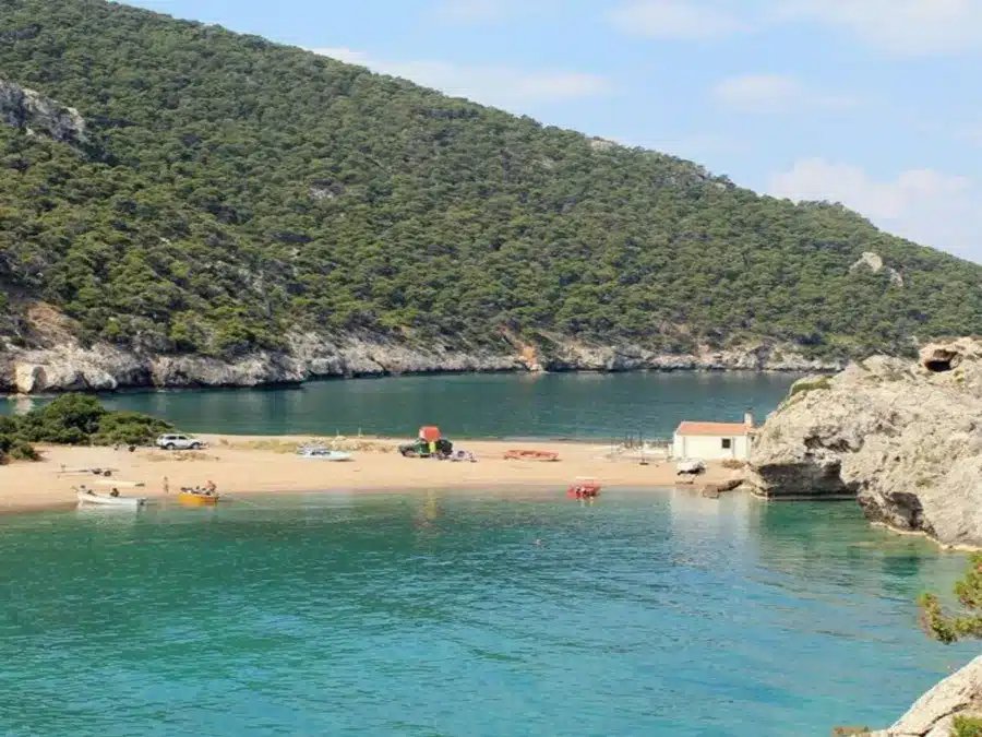 Η παραλία με κρυστάλλινα νέρα που περιτριγυρίζεται από πεύκα