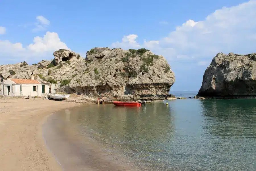 Βασικά, πρόκειται για μια παραλία που έχει διαμορφωθεί από έναν αρχαίο σεισμό. Η μία πλευρά της έχει σκούρη αμμουδιά, ενώ η άλλη έχει εντυπωσιακές ρηγματώδεις πλάκες από την έντονη σεισμικότητα της περιοχής. Τα νερά είναι κρυστάλλινα και έχουν ένα όμορφο σμαραγδένιο χρώμα.