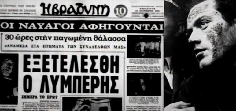 Εξώφυλλο εφημερίδας της εποχής με πρώτη είδηση την εκτέλεση του Βασίλη Λυμπέρη