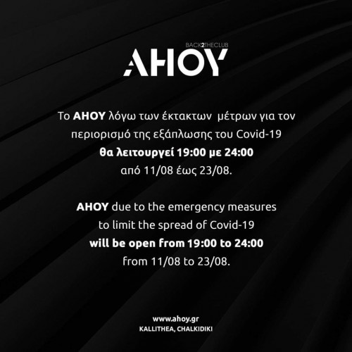 Νέα ωράρια λειτουργίας εφαρμόζουν και κλαμπ στη Χαλκιδική, με τους επιχειρηματίες να προσπαθούν να μειώσουν στο μέτρο του δυνατού τις οικονομικές απώλειες από τους περιορισμούς στο ωράριο. Το παλαιότερο κλαμπ της Χαλκιδικής, το AHOY, ενημέρωσε ήδη το κοινό του ότι θα λειτουργεί πλέον από τις 19.00 έως τα μεσάνυχτα.