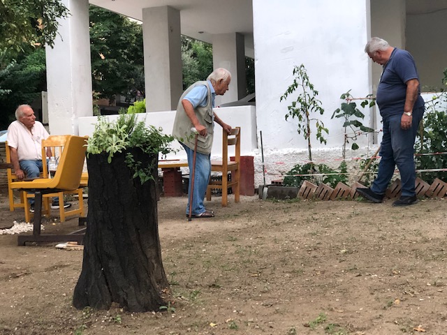 «Ερχόμαστε εδώ και βρισκόμαστε, κρατώντας όμως τις αποστάσεις. Ήταν πολύ δύσκολα με την καραντίνα και εδώ μπορούμε να συναντηθούμε με ασφάλεια, να ανταλλάξουμε καμιά κουβέντα», ανέφεραν ο Φλωριάς Λαγκούσης και ο φίλος του Σόλωνας Ουσατζόπουλος, εξηγώντας πώς διαμόρφωσαν το μέρος ώστε να αποτελέσει το σημείο της καθημερινής τους συνάντησης: «Φυτέψαμε δέντρα, φέραμε νερό και εδώ πλέον μπορούμε να πάρουμε την ανάσα μας. Είναι ένα υπαίθριο καφενείο καθώς πλέον δεν μπορούμε να πάμε σε καφενείο και εδώ βρισκόμαστε και συζητάμε».