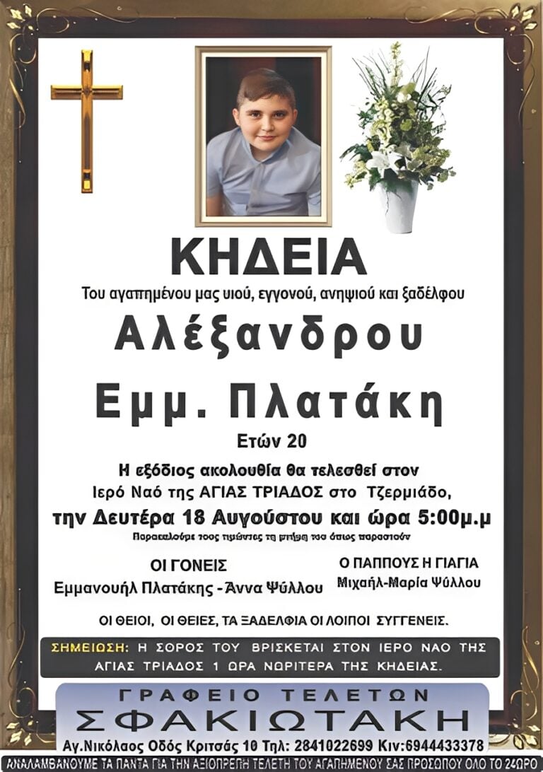 Σύμφωνα με το cretaone.gr ανείπωτη θλίψη σκόρπισε στο Τζερμιάδο η είδηση του θανάτου του νεαρού Αλέξανδρου Πλατάκη, ο οποίος έφυγε από τη ζωή σε ηλικία 20 ετών.