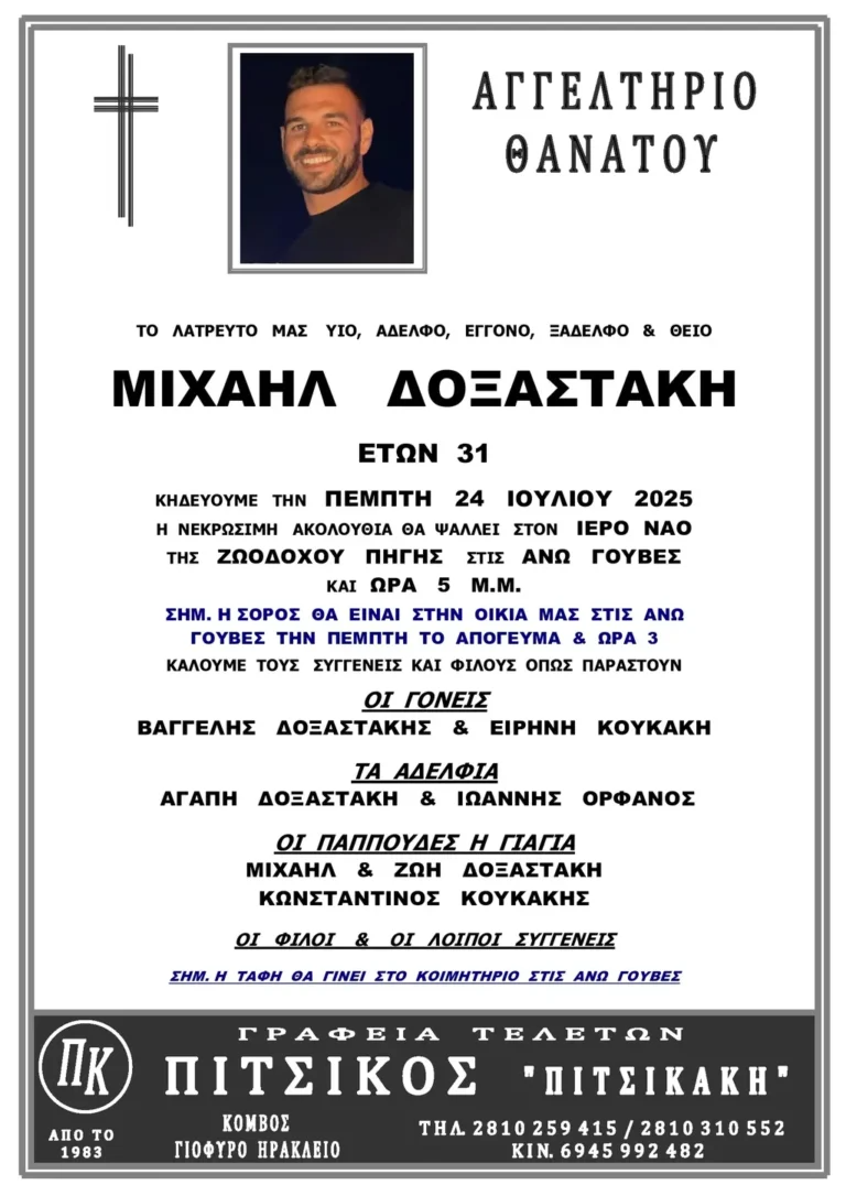 Ανείπωτη θλίψη και βαθιά συγκίνηση επικρατεί στις Γούβες Ηρακλείου, μετά την είδηση του θανάτου του Μιχάλη Δοξαστάκη, ενός νέου ανθρώπου μόλις 31 ετών. Η απώλεια του έχει βυθίσει στο πένθος την τοπική κοινωνία, καθώς ήταν ιδιαίτερα αγαπητός.