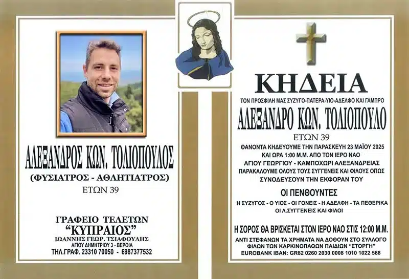 Έφυγε από τη ζωή, σε ηλικία 39 ετών, ο φυσίατρος – αθλητίατρος Αλέξανδρος Κων. Τολιόπουλος.