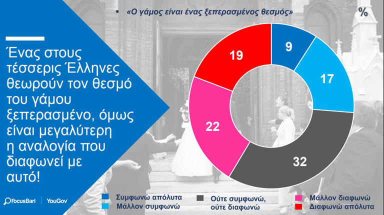 Στην φράση «ο γάμος είναι ένας ξεπερασμένος θεσμός», οι μικρότερες ηλικίες τείνουν να συμφωνούν περισσότερο. Ενδεικτικά, το 33% των ατόμων μεταξύ 18 και 24 ετών θεωρεί λίγο ή πολύ ότι είναι ξεπερασμένος και το 35% στις ηλικίες 25-34 ετών. Αντίθετα μεταξύ 35 και 44 ετών το ποσοστό αυτό ανέρχεται στο 26% του συνόλου και μεταξύ 35 και 54 ετών στο 21%. Τέλος, παρατηρείται πως οι singles τείνουν περισσότερο σε σχέση με τους παντρεμένους να θεωρούν τον γάμο ξεπερασμένο θεσμό.