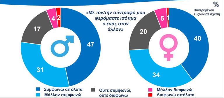Αξίζει να σημειωθεί ότι σύμφωνα με την έρευνα της Focus Bari, τρεις στους τέσσερις Έλληνες πιστεύουν πως υπάρχει ισότιμη συμπεριφορά στη σχέση τους με μόλις 6% συνολικά να διαφωνεί μερικώς ή απόλυτα. Βέβαια, όπως διαφαίνεται από την έκθεση, οι άνδρες (ετεροφυλόφιλοι) τείνουν να θεωρούν ελαφρώς περισσότερο πως φέρονται ισότιμα με την σύντροφό τους. Συγκεκριμένα, το 47% είναι απολύτως σίγουροι ότι υπάρχει ισότητα στη σχέση τους και το 31% μερικώς. Απεναντίας, το 40% των γυναικών απάντησε με απόλυτη βεβαιότητα ότι υπάρχει ισότητα στο ζευγάρι και το 34% δήλωσε ότι συμφωνεί μερικώς με τη δήλωση αυτή.