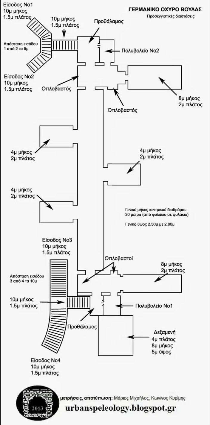Είναι ένα αρκετά μεγάλο σύμπλεγμα υπόγειων διαδρόμων, που αποτελείται από δύο παράλληλες βασικές στοές και άλλες μικρότερες που τις συνδέουν μεταξύ τους, κάθετα προς αυτές, ενώ υπάρχουν και άλλες που είναι τυφλές (καταλήγουν σε βράχο). Υπάρχουν εσωτερικές μεταλλικές πόρτες και μερικά σημεία διαμορφωμένα και χτισμένα με σύγχρονα τούβλα.