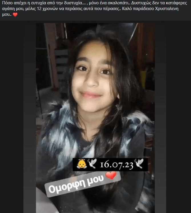 «Πόσο απέχει η ευτυχία από την δυστυχία…., μόνο ένα σκαλοπάτι… Δυστυχώς δεν τα κατάφερες αγάπη μου, μόλις 12 χρονών να περάσεις αυτά που πέρασες… Καλό παράδεισο Χρυσταλλένη μου…»,