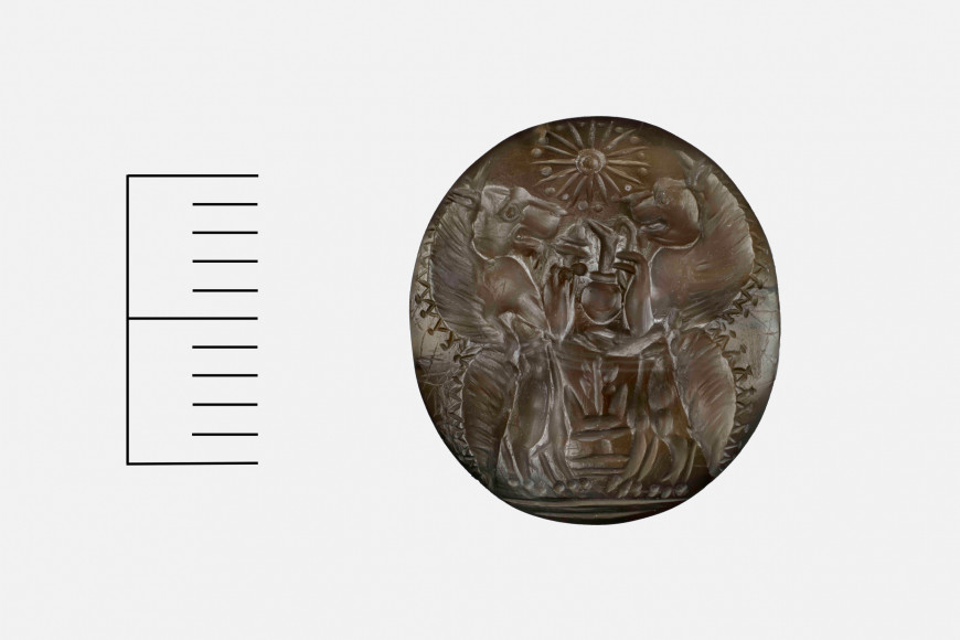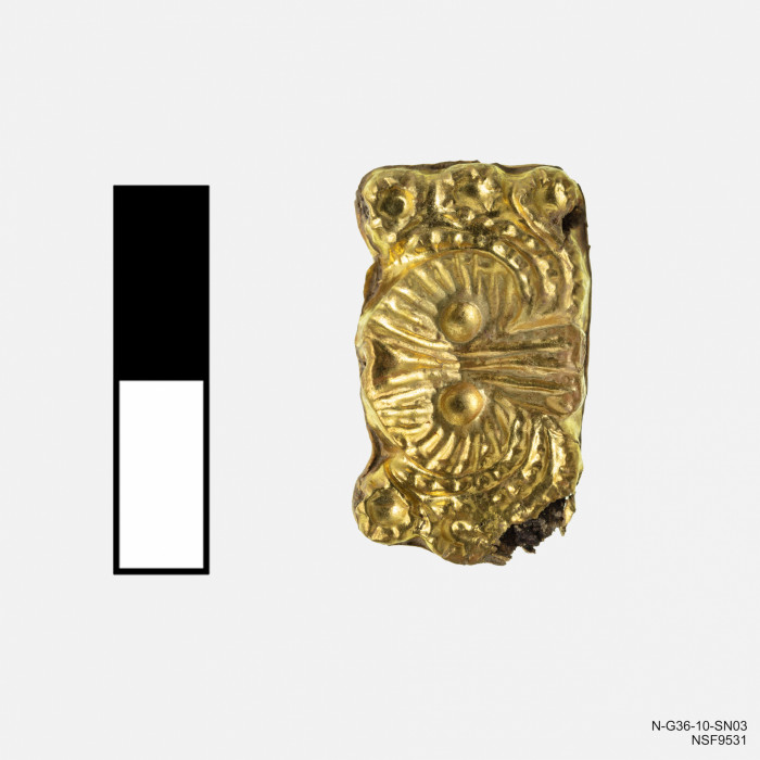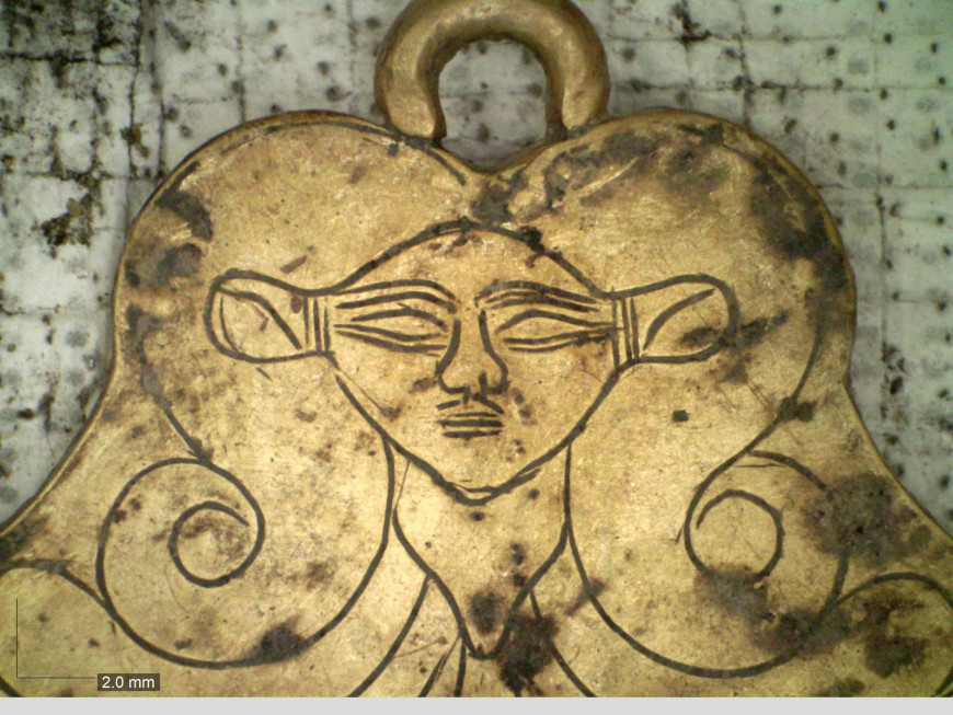 Ανακαλύφθηκε επίσης ένα χρυσό μενταγιόν που απεικονίζει την κεφαλή της Αιγύπτιας θεάς ‘Αθωρ. «Αυτή η ανακάλυψη παρουσιάζει ιδιαίτερο ενδιαφέρον, λαμβάνοντας υπόψη τον ρόλο που είχε στην Αίγυπτο ως προστάτιδα των νεκρών». Επισήμανε ο Τζακ Ντέηβις προσθετοντας: «εξαιρετικά παρόμοιο με τους θαλαμωτούς τάφους που απεκάλυψε μεταγενέστερα στις Μυκήνες η ανασκαφική δραστηριότητα του Χρήστου Τσούντα τον 19ο αιώνα, ιδίως ως προς το ύφος των κοσμημάτων και άλλων διάκοσμων, ενώ βρέθηκαν και στοιχεία, τα οποία απουσίαζαν στην Πύλο, και μαρτυρούν δεσμούς με την εγγύς Ανατολή και την Αίγυπτο».