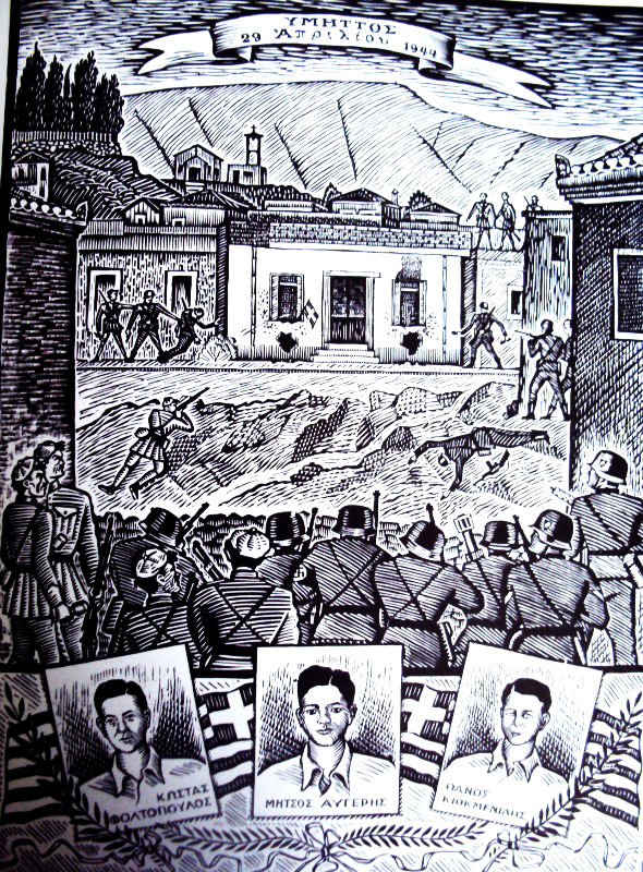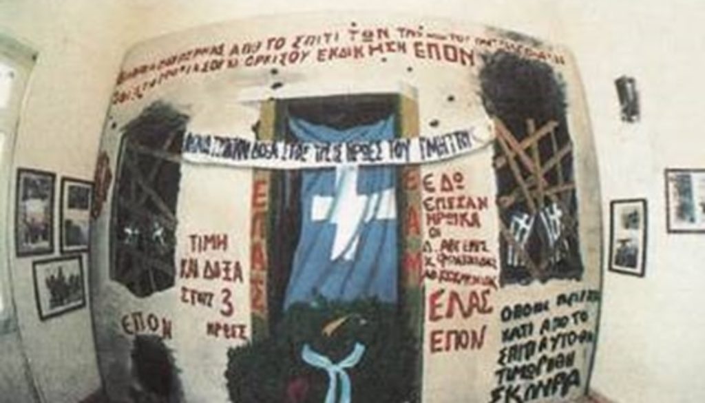 Ένα σκοτεινό βράδυ και ενώ οι Γερμανοί δεν είχαν ακόμη αποχωρήσει από την Αθήνα κάποιοι πήγαν και έγραψαν με κόκκινη μπογιά στο λευκό τοίχο του σπιτιού: «Διαβάτη που περνάς από το σπίτι των τριών ηρώων του Υμηττού, γονάτισε, σφίξε τη γροθιά σου και ορκίσου εκδίκηση – ΕΠΟΝ»