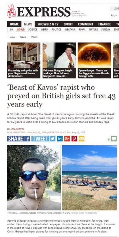 Οι εφημερίδες Express και Sun φιλοξενούν εκτενή ρεπορτάζ για τον Δημήτρη Ασπιώτη ο οποίος το 2012 καταδικάστηκε στη μεγαλύτερη ποινή που είχε επιβληθεί μέχρι τότε σε βιαστή. H Sun κάνει μάλιστα λόγο για το το «τέρας του Κάβου« στον τίτλο της. Η Express τον χαρακτηρίζει «κτήνος» που βίαζε κοπέλες από τη Βρετανία. Επιπλέον η Sun αναφέρει πως ο Ασπιώτης εθεάθη σε μπαρ και επίσης φιλοξενεί και δήλωσή του. «Έχω γνωρίσει ένα κορίτσι τώρα και είναι η μόνη που με ενδιαφέρει». Τονίζει πως λυπάται πολύ για όσα έκανε στο παρελθόν ενώ προσθέτει πως θα έκανε τα πάντα για να το άλλαζε.