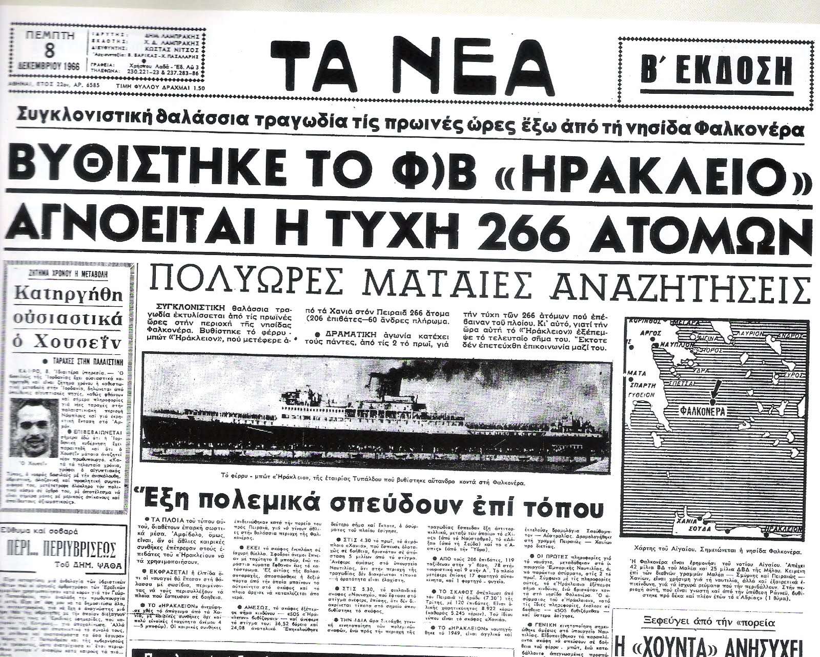 Το ημερολόγιο έγραφε 8 Δεκεμβρίου 1966 όταν το επιβατηγό-οχηματαγωγό πλοίο «Ηράκλειον», που εκτελούσε το ακτοπλοϊκό δρομολόγιο Πειραιάς-Χανιά και Πειραιάς -Ηράκλειο, βυθίστηκε 6 μίλια βορειοανατολικά της Φαλκονέρας.