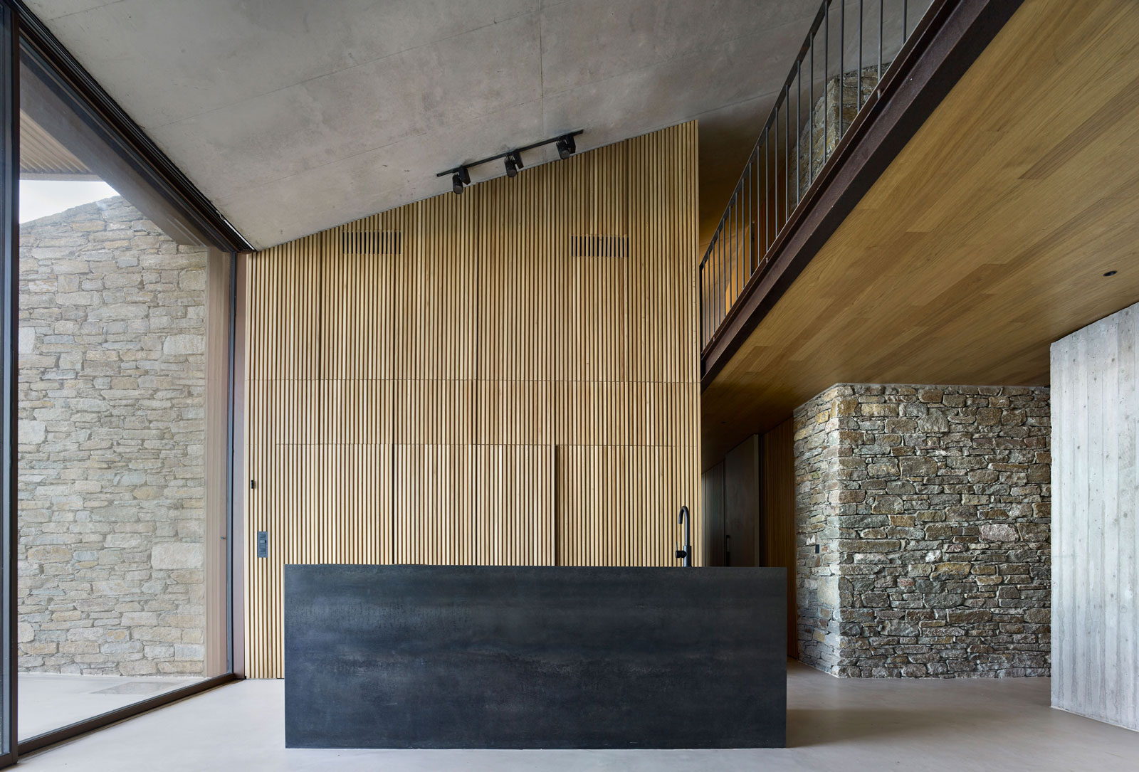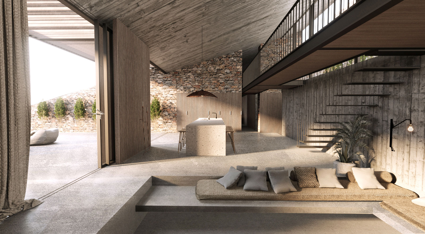 Τα εξωτερικά σκαλιά ενσωματώνονται με την πλαγιά και ενώνουν τα τρία επίπεδα με την κύρια είσοδο, που βρίσκεται στο loft του σαλονιού.
