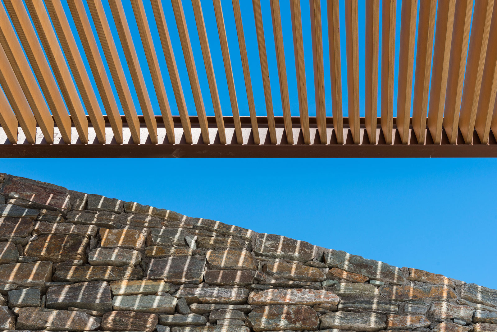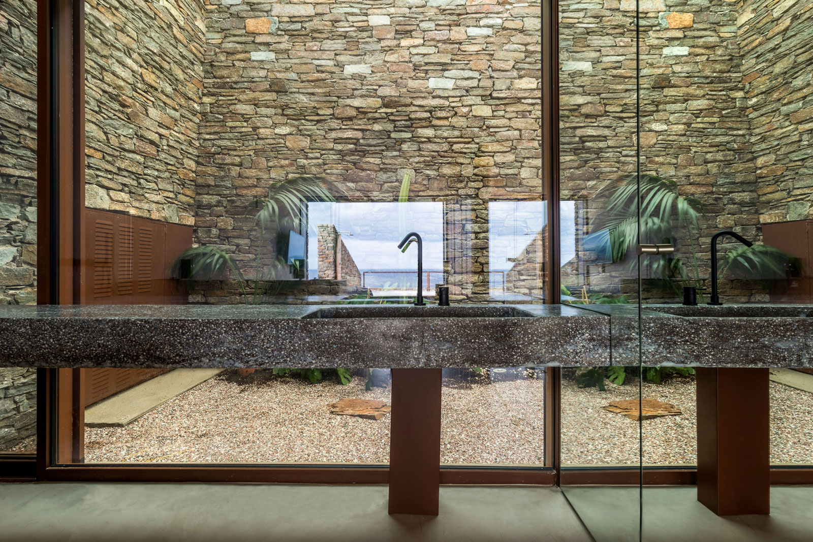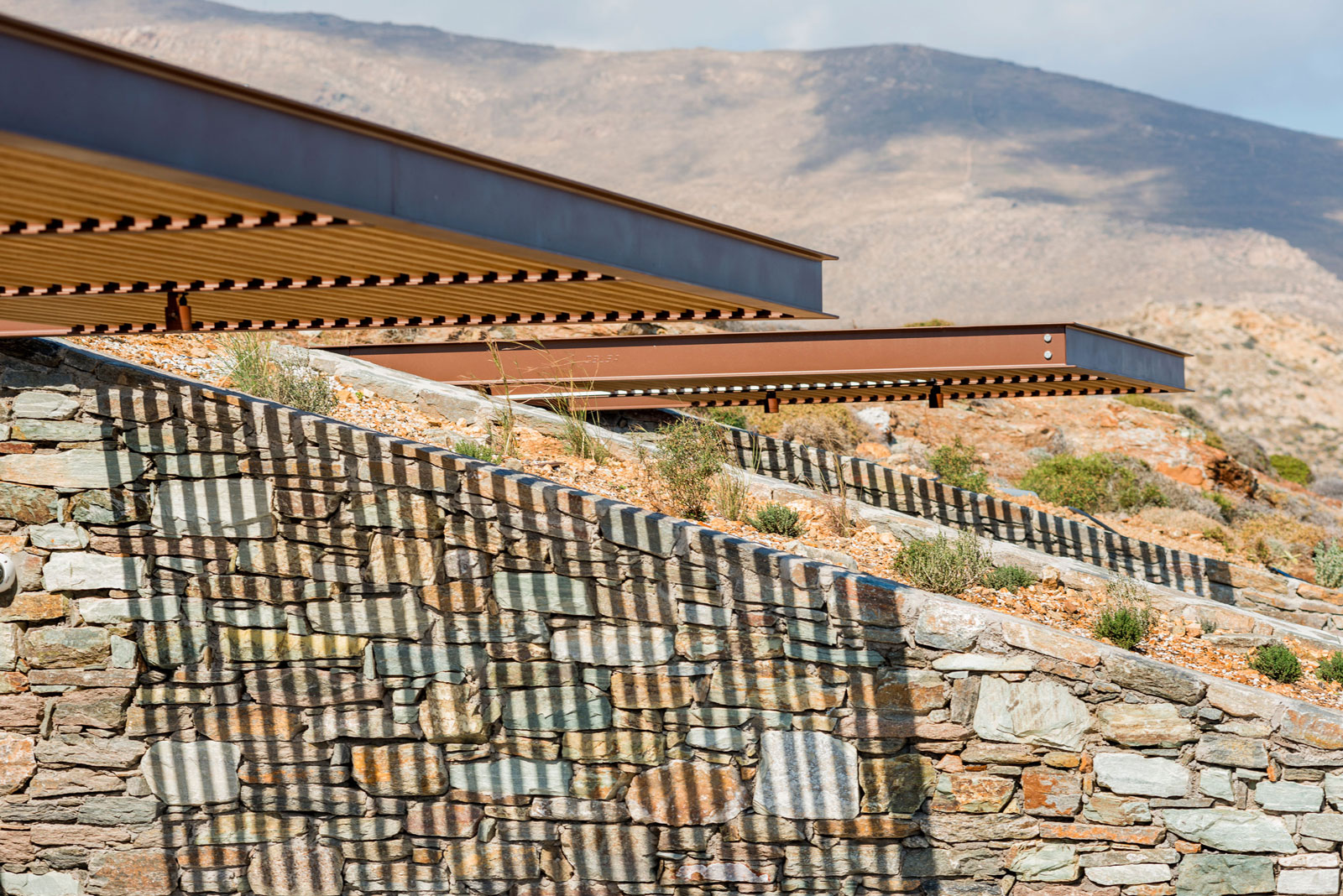 Οι ογκώδεις τοίχοι είναι φτιαγμένοι από ξερολιθιά, ενώ οι μπροστινές όψεις είναι ελαφριές, γυάλινες και παρέχουν άπλετο φως.