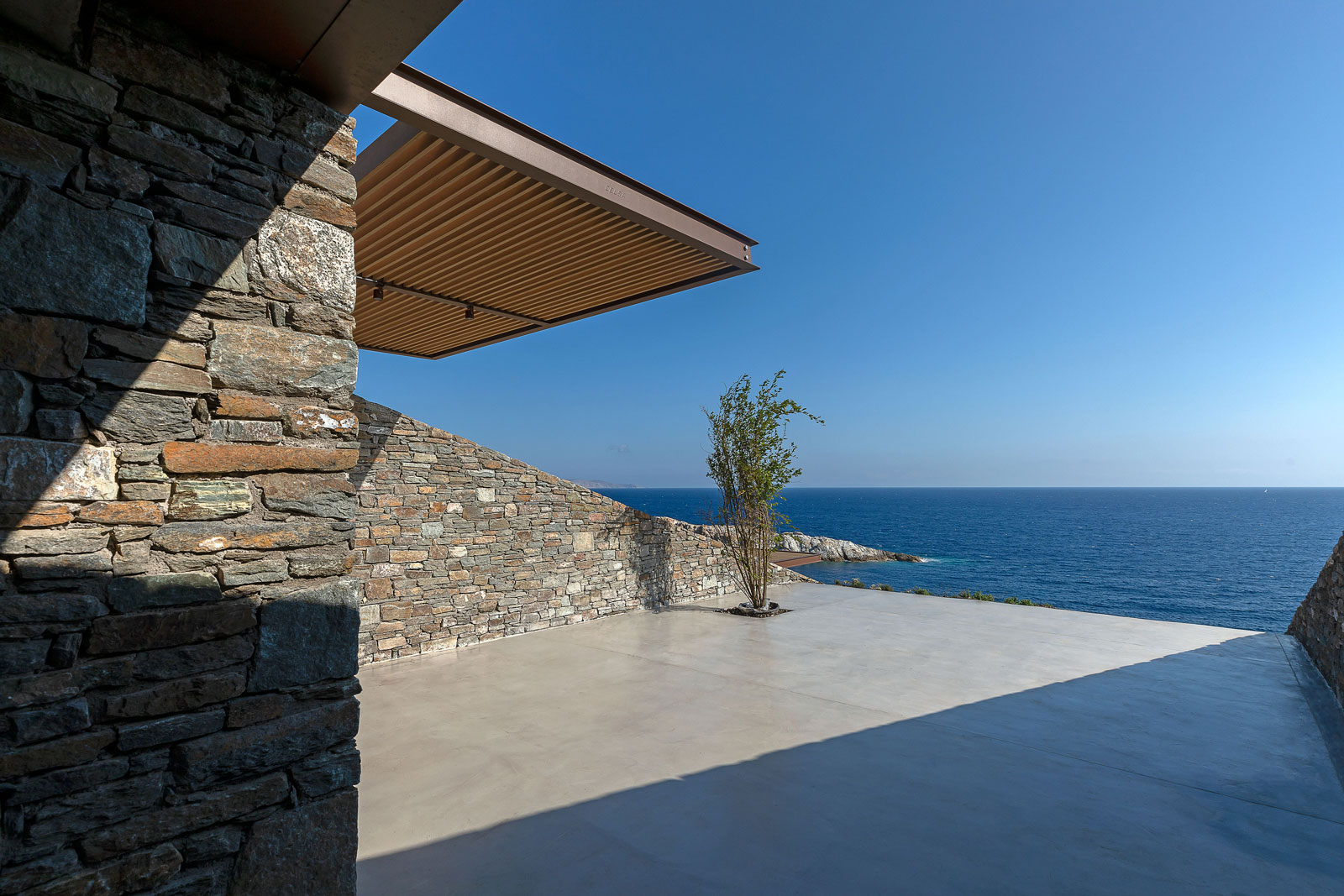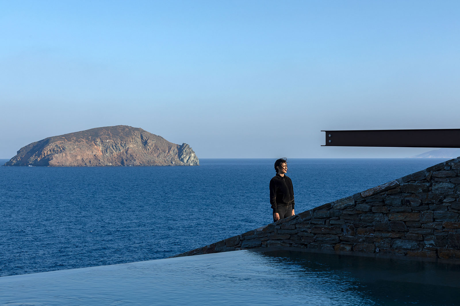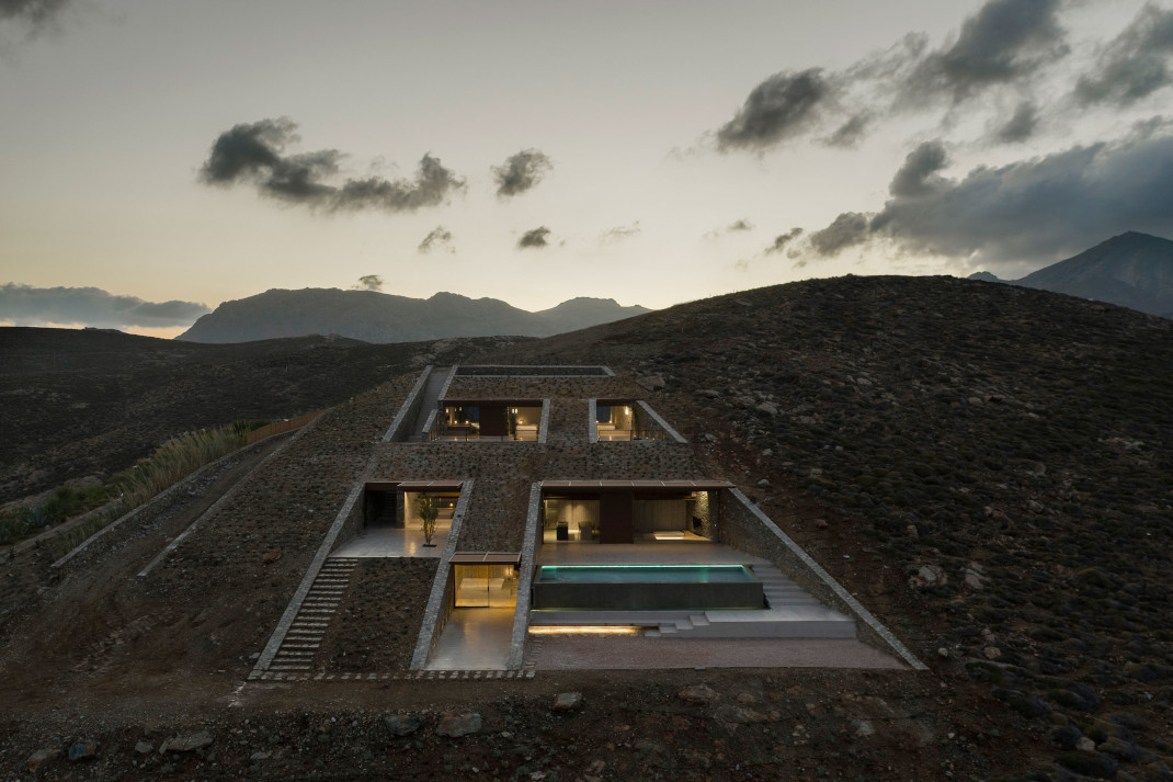 Το ορθογώνιο σχήμα του εναρμονίζεται με την κλίση της πλαγιάς και δημιουργεί τρισδιάστατη «σκακιέρα» πλήρων και κενών. Η αυστηρή γεωμετρία, όμως, του διακόπτεται από τον εξωτερικό άξονα που ανοίγει προς τα κάτω και προσφέρει μια μαγευτική θέα στο ατελείωτο γαλάζιο του Αιγαίου.