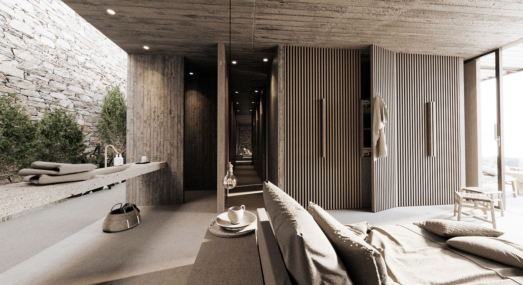 «Το τραχύ αίσθημα της φυσικής κοιλότητας ήταν αυτό που θέλαμε να αναδημιουργήσουμε με την επιλογή των υλικών και της χρωματικής παλέτας. Πέτρα, σκυρόδεμα, ξύλο και μέταλλο χρησιμοποιούνται με ακρίβεια για να δημιουργηθούν τραχιά, εσωτερικά κελύφη», σύμφωνα με την ιδιοκτήτρια της Mold Architects, Ηλιάνα Κερεστετζή, που βρίσκεται πίσω από το εντυπωσιακό έργο.