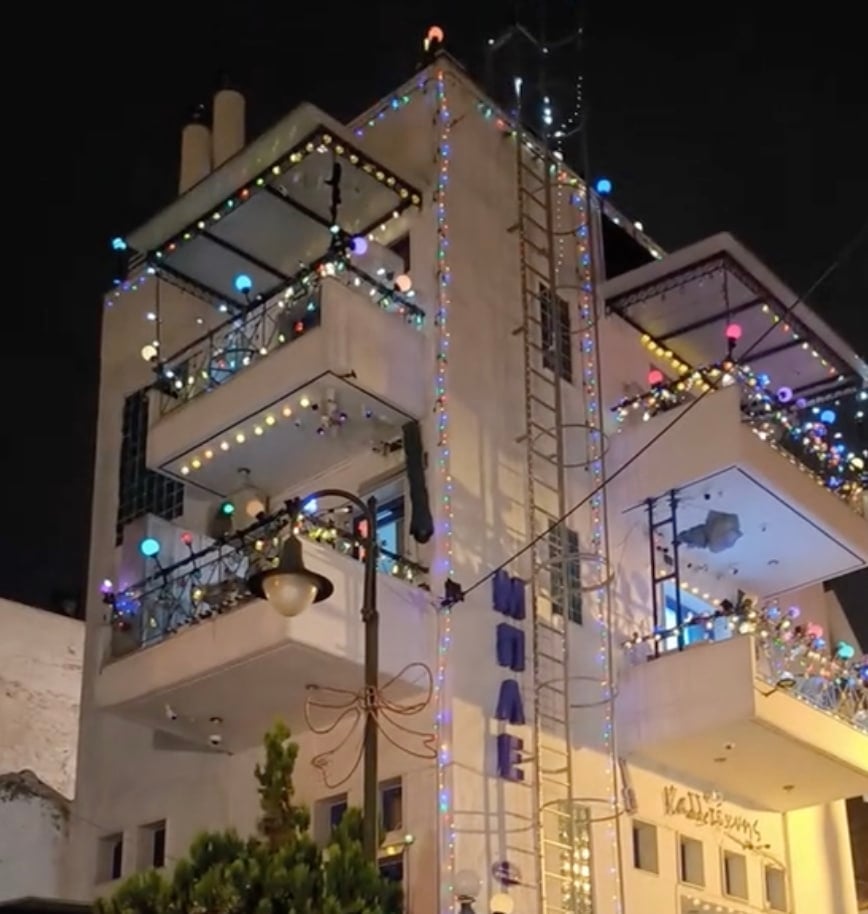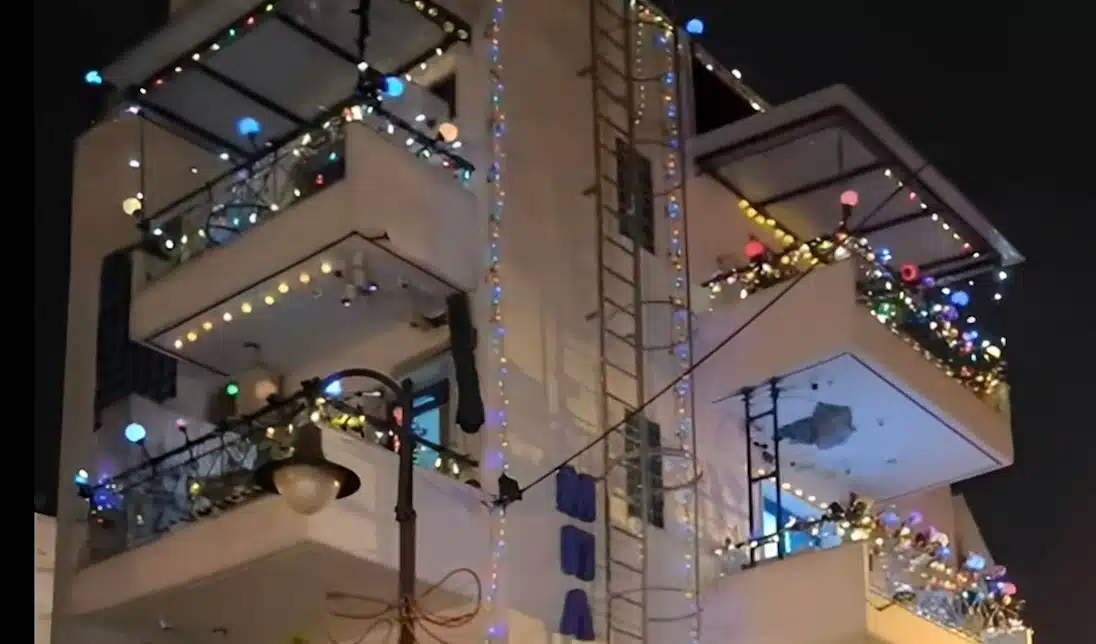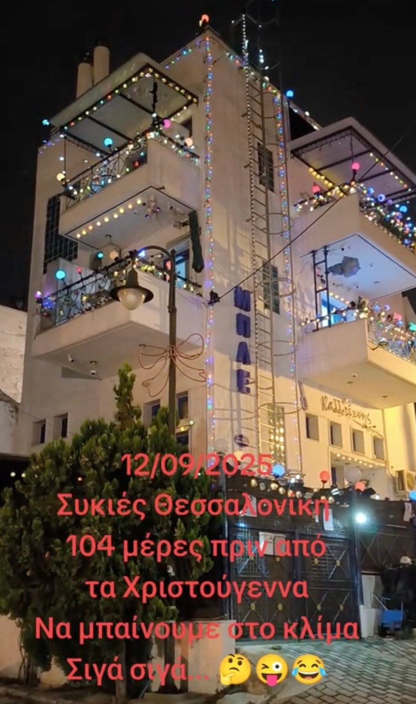 Πρόκειται για ένα βίντεο που δείχνει μια πολυκατοικία στις Συκιές Θεσσαλονίκης, η οποία είναι στολισμένη με χριστουγεννιάτικα λαμπιόνια από την κορυφή μέχρι τη βάση της – και όλα αυτά, ενώ βρισκόμαστε μόλις στις αρχές του Σεπτεμβρίου, περίπου 110 μέρες πριν τα Χριστούγεννα.