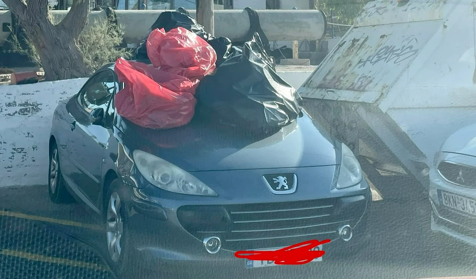 Ένα αυτοκίνητο ήταν παρκαρισμένο μπροστά από κοντέινερ σκουπιδιών, στη Σύρο, με τους πολίτες να εναποθέτουν τα σκουπίδια τους στο παρμπρίζ του.