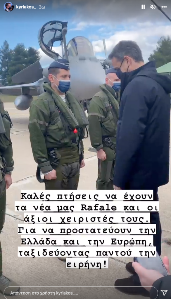 Σε άλλα δύο story που δημοσίευσε, διακρίνονται στη μια τα Rafale να «σκίζουν» τον ελληνικό ουρανό, με τη φράση «Υπερήφανη η πατρίδα μας, υποδέχεται σήμερα τα πρώτα 6 από τα 24 υπερσύγχρονα Rafale» και στην άλλη ο πρωθυπουργός να χαιρετά τους χειριστές των αεροσκαφών, γράφοντας παράλληλα: