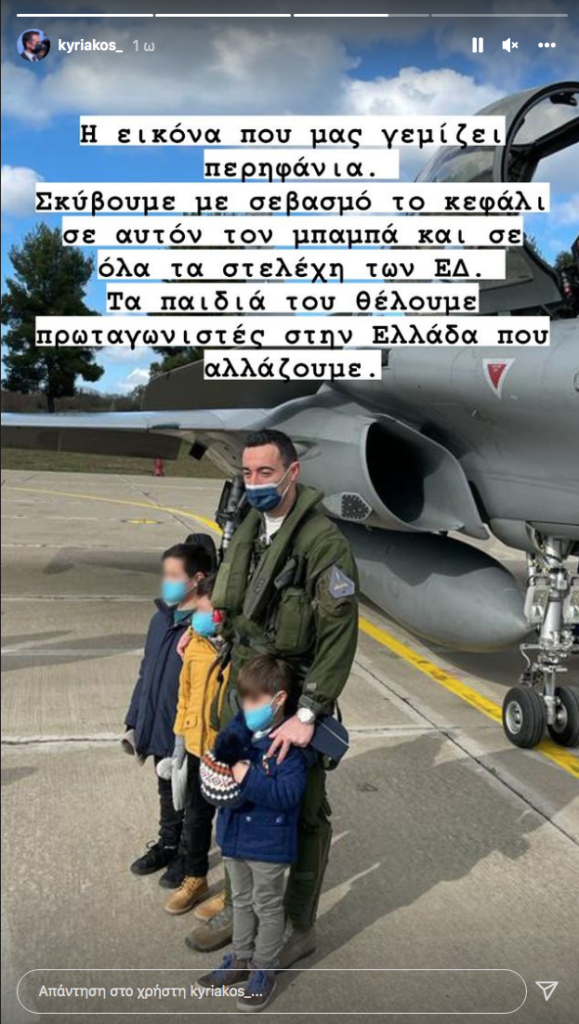 Τη φωτογραφία ενός πιλότου με τα τρία του παιδιά μπροστά από ένα αεροσκάφος Rafale ανήρτησε στον προσωπικό του λογαριασμό στο Ιnstagram, ο Πρωθυπουργός, Κυριάκος Μητσοτάκης.