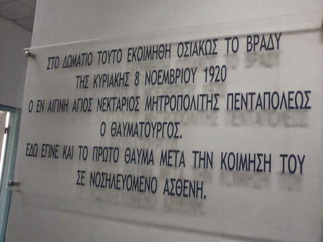 «Στον θαυματουργό Άγιο Νεκτάριο που στο θάλαμο τούτο μου ξανάδωσε τη ζωή (χειρουργικά) το 1963. Με ανείπωτη ευλάβεια και αιώνια ευγνωμοσύνη», έγραφε ο λογοτέχνης Ιωάννης Σηφάκης, σε μια εικόνα που βρίσκεται πάνω από το κρεβάτι του Αγίου.