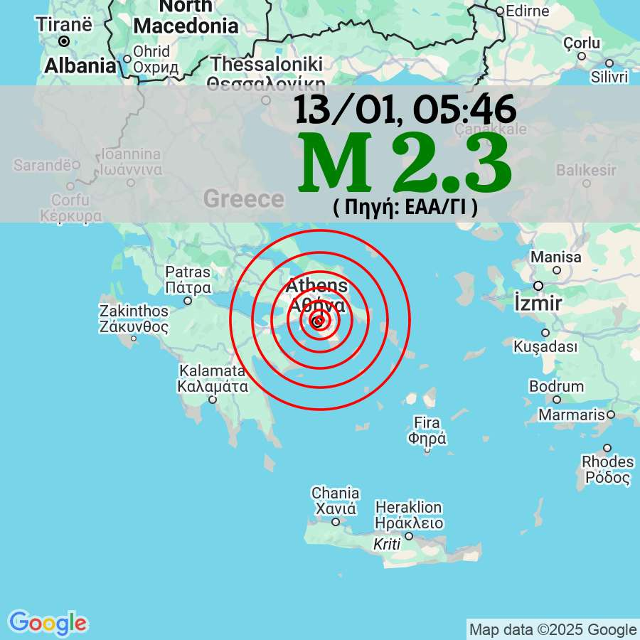 Το ακριβές επίκεντρο της δόνησης εντοπίζεται στα 5 χλμ. νοτιοδυτικά των Αθηνών.
