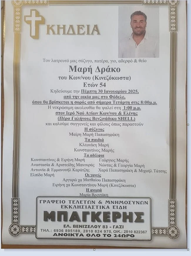 Η κηδεία του θα πραγματοποιηθεί αύριο, στο Φόδελε. Η νεκρώσιμος ακολουθία θα ψαλλεί στις 13:00 στο εκκλησάκι της οικογένειας στους Πέρα Γαλήνους.