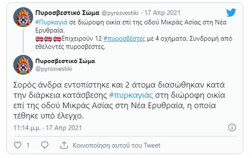 Τραγωδία στη Νέα Ερυθραία με νεκρό άνδρα που φέρεται να έβαλε τη πυρκαγιά