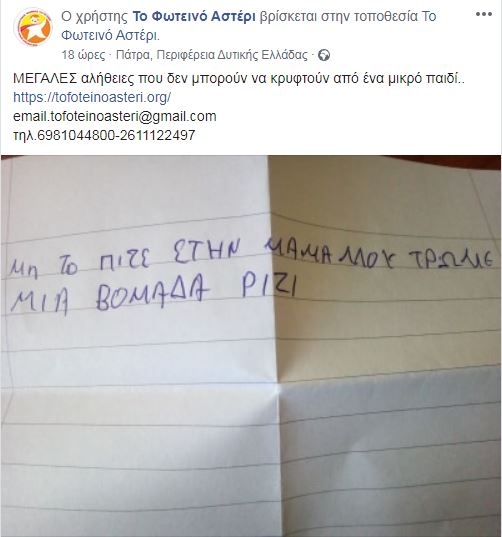 Σημείωμα 9χρονου αγοριού: Μία οικογένεια από την Πάτρα διανύει δύσκολες ημέρες στην καθημερινότητά της. Το σημείωμα από ένα εννιάχρονο παιδί ουσιαστικά «πρόδωσε» την κατάσταση που επικρατεί στην οικογένειά του. Από εκεί και πέρα, το σημείωμα που άφησε το εννιάχρονο παιδί στο «Φωτεινό αστέρι» έγραφε πως ήθελε να του πάρουν ρούχα. Μάλιστα, το είχε επισκεφθεί με τους γονείς του.