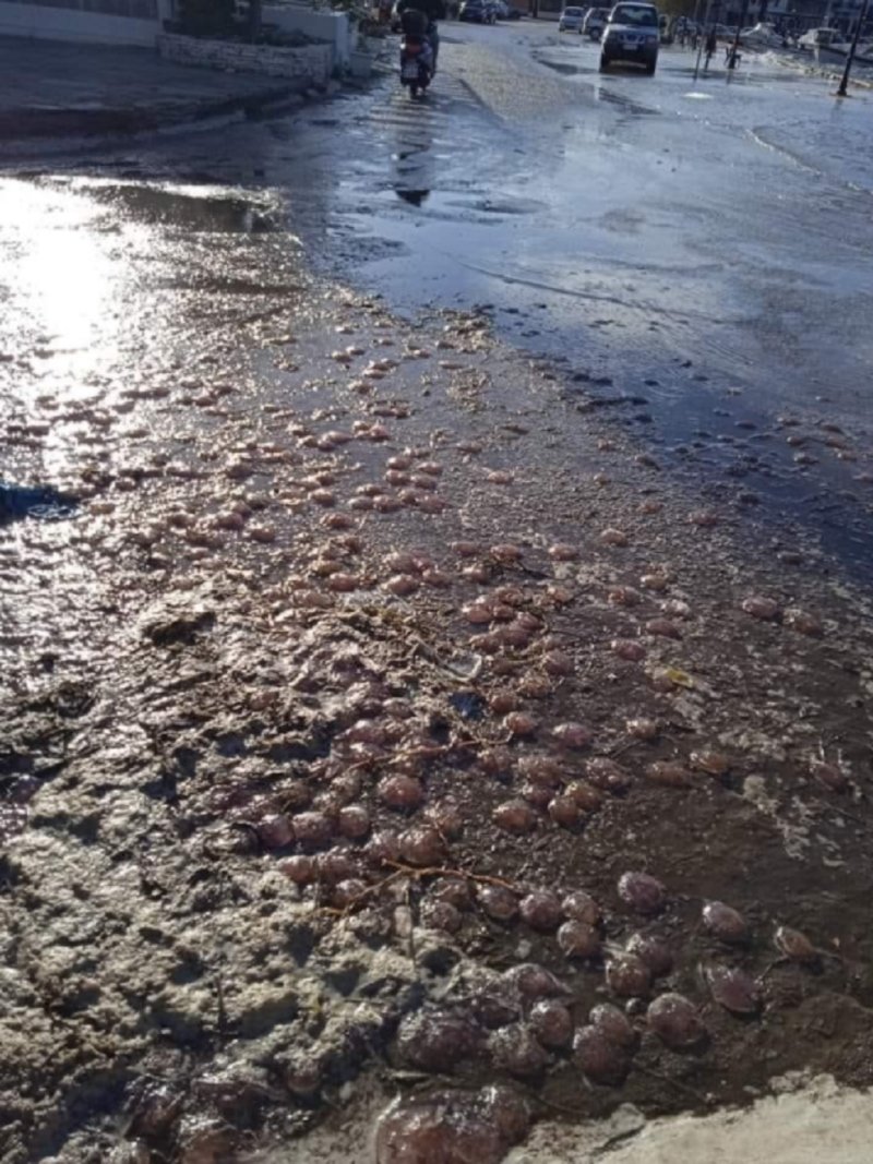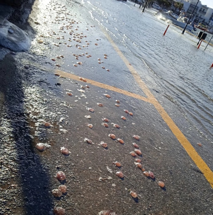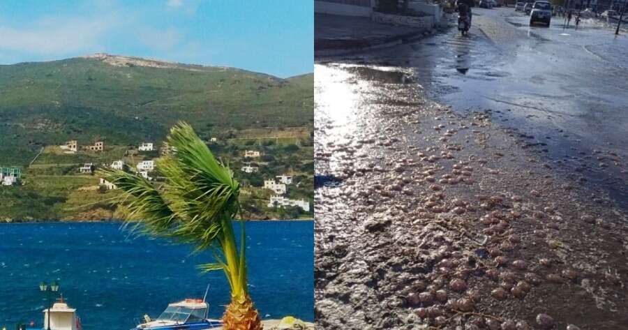 Τσούχτρες στον δρόμο αντίκρισαν με έκπληξη οι κάτοικοι των θαλάσσιων περιοχών στην Άνδρο, λόγω των σφοδρών ανέμων.