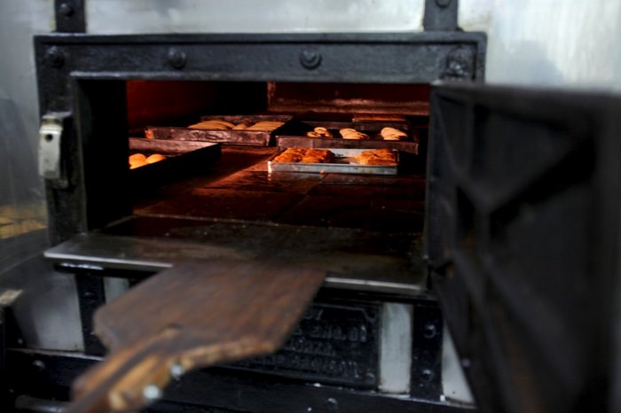 Τεχνικά στηριζόμαστε σε ένα φούρνο, τον οποίο εμπνεύστηκε το 1931 ένας Άγγλος που λεγόταν Dumbrill για τις ανάγκες της αγοράς της Βιέννης. Αυτό το μοντέλο μπήκε σε εμάς το 1950, μέχρι τότε οι φούρνοι δούλευαν με κοκ, ξύλα και κάρβουνο. Μας έλυσε τα χέρια, δουλέυει με οποιαδήποτε πρώτη ύλη, πρώτα με πετρέλαιο και τώρα με φυσικό αέριο. Επίσης είναι πολύ μεγάλος και μας επιτρέπει να φτιάχνουμε τις τυρόπιτες σαν να είχαν ψηθεί σε φούρνο ξύλου, στιλπνές και τραγανιστές χάρη στο αλάβαστρον που έχει μέσα. Νομίζω ότι δεν υπάρχει άλλος τέτοιος στην Ευρώπη, είναι πολύ ενεργοβόρος και η εταιρεία έκλεισε από τότε. Δε σου κρύβω ότι υπάρχουν άνθρωποι που δούλεψαν εδώ, πήραν τη συνταγή και αργότερα έκαναν δική τους επιχείρηση αλλά κανείς ποτέ δεν μπόρεσε να πετύχει αυτή την ποιότητα.