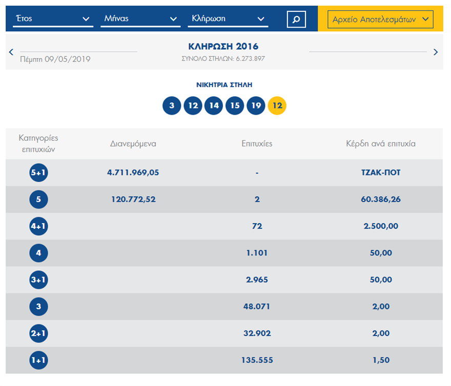 Επίσης, οι συνολικές στήλες που παίχτηκαν στην τελευταία κλήρωση του τυχερού παιχνιδιού του ΟΠΑΠ, με αριθμό 2016, ήταν 6.273.897.