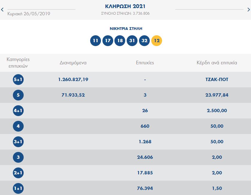 Επίσης, οι συνολικές στήλες που παίχτηκαν στην τελευταία κλήρωση του τυχερού παιχνιδιού του ΟΠΑΠ, με αριθμό 2021, ήταν 3.736.806.