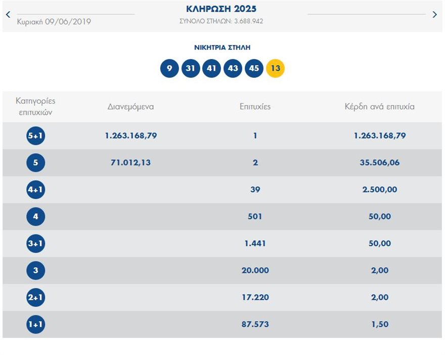 Επίσης, οι συνολικές στήλες που παίχτηκαν στην τελευταία κλήρωση του τυχερού παιχνιδιού του ΟΠΑΠ, με αριθμό 2025, ήταν 3.688.942.
