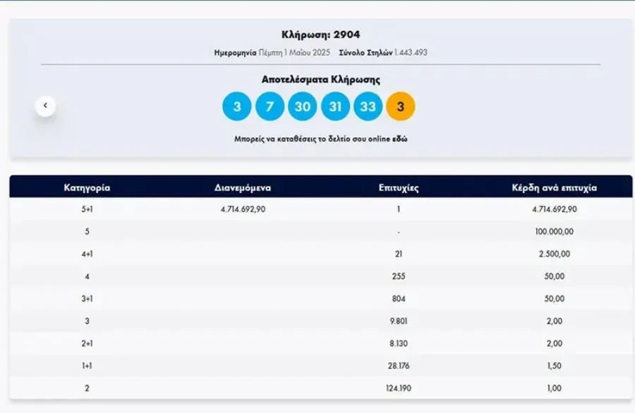 Στην κλήρωση της Πέμπτης 01/5/25, οι τυχεροί αριθμοί που κληρώθηκαν ήταν: 3, 7, 30, 31, 33 και αριθμός Τζόκερ το 3.