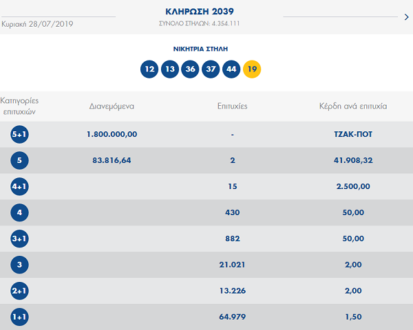 Επίσης, οι συνολικές στήλες που παίχτηκαν στην τελευταία κλήρωση του τυχερού παιχνιδιού του ΟΠΑΠ, με αριθμό 2039, ήταν 4.354.111.