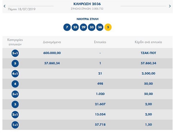 Επίσης, οι συνολικές στήλες που παίχτηκαν στην τελευταία κλήρωση του τυχερού παιχνιδιού του ΟΠΑΠ, με αριθμό 2036, ήταν 3.005.732.