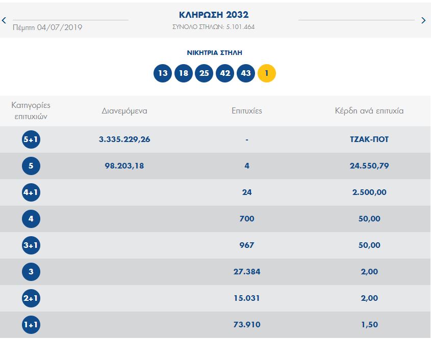 Επίσης, οι συνολικές στήλες που παίχτηκαν στην τελευταία κλήρωση του τυχερού παιχνιδιού του ΟΠΑΠ, με αριθμό 2032, ήταν 5.101.464.