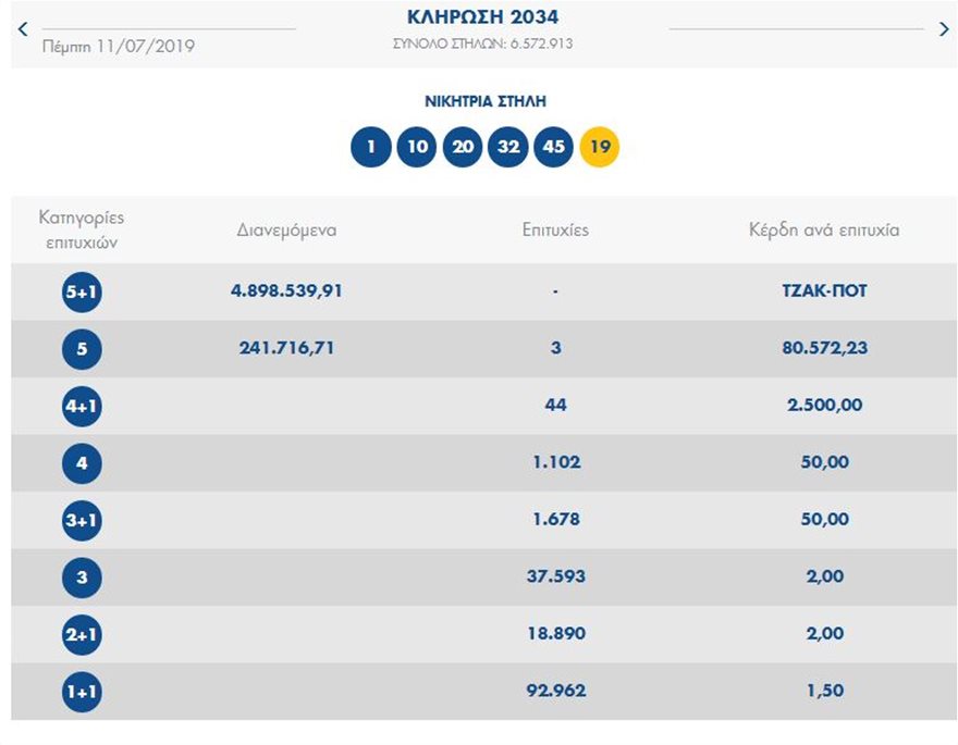 Επίσης, οι συνολικές στήλες που παίχτηκαν στην τελευταία κλήρωση του τυχερού παιχνιδιού του ΟΠΑΠ, με αριθμό 2034, ήταν 6.572.913.