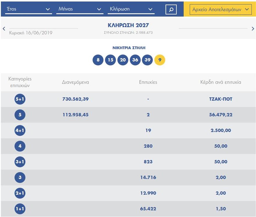 Επίσης, οι συνολικές στήλες που παίχτηκαν στην τελευταία κλήρωση του τυχερού παιχνιδιού του ΟΠΑΠ, με αριθμό 2027, ήταν 2.988.473.