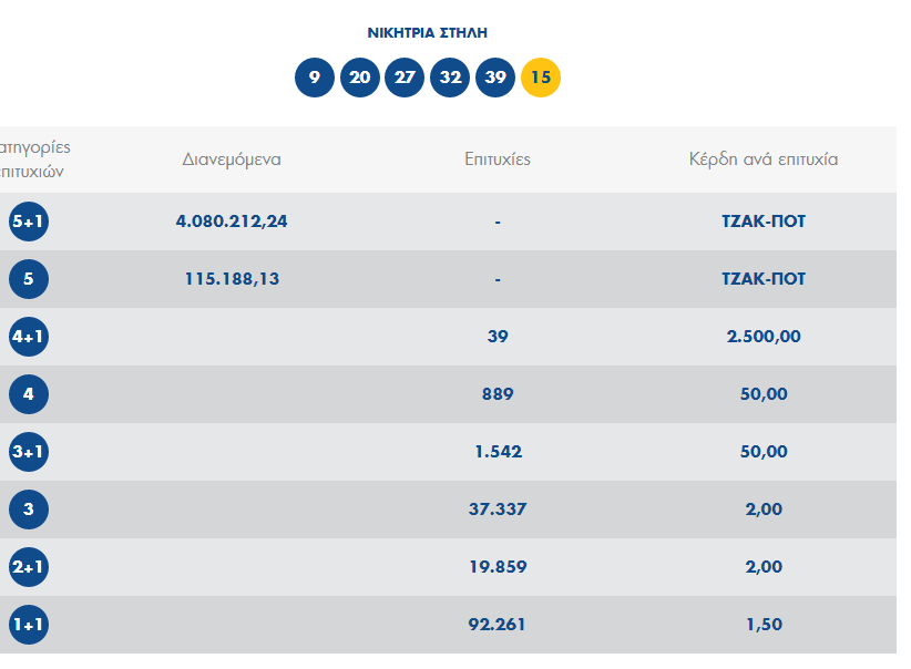 4+1: Οι επιτυχίες ήταν 39. Τα κέρδη ανά επιτυχία ήταν 2.500,00 ευρώ.