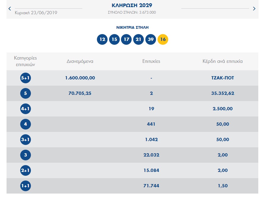 Επίσης, οι συνολικές στήλες που παίχτηκαν στην τελευταία κλήρωση του τυχερού παιχνιδιού του ΟΠΑΠ, με αριθμό 2029, ήταν 3.673.000.