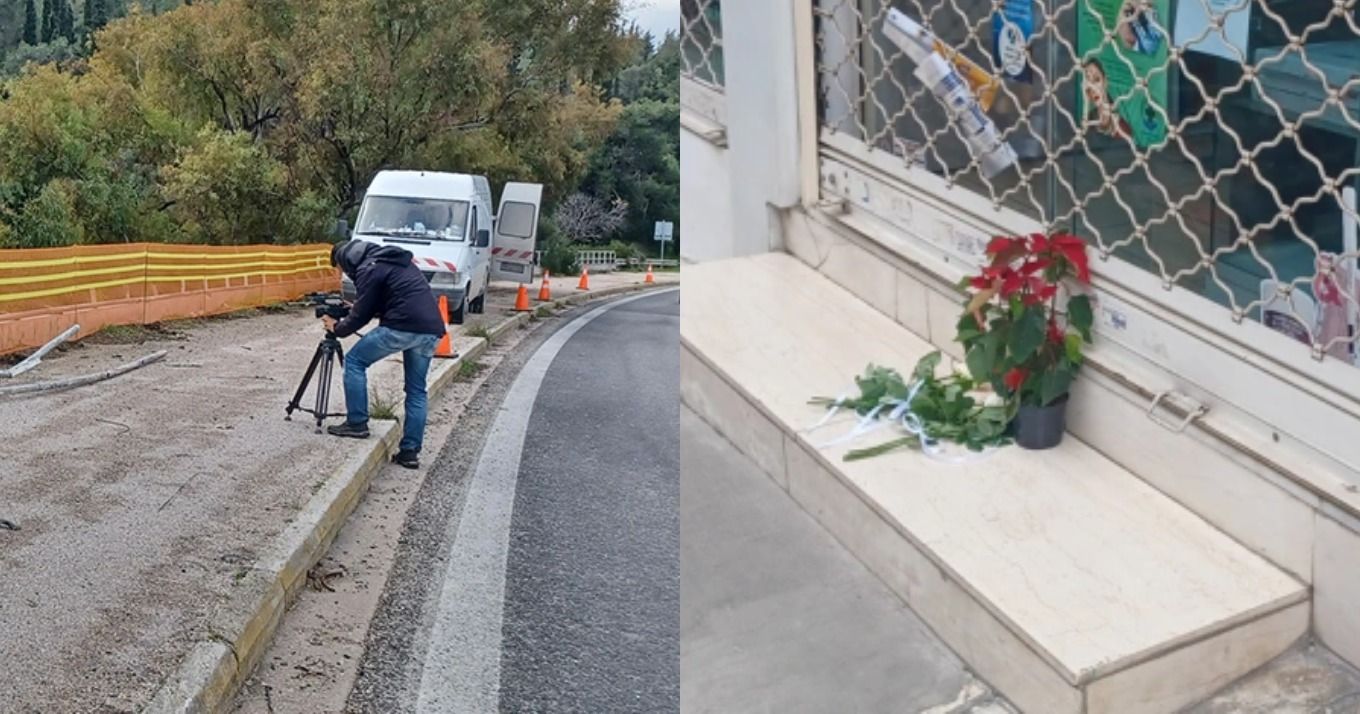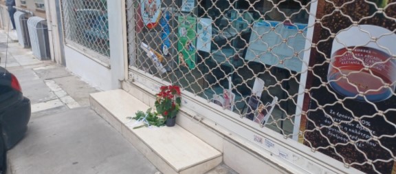 Γείτονες έσπευσαν να αφήσουν λουλούδια και κεριά έξω από τα κατεβασμένα κάγκελα του φαρμακείου, μπροστά στην είσοδο που έκλεισε χθες το βράδυ.