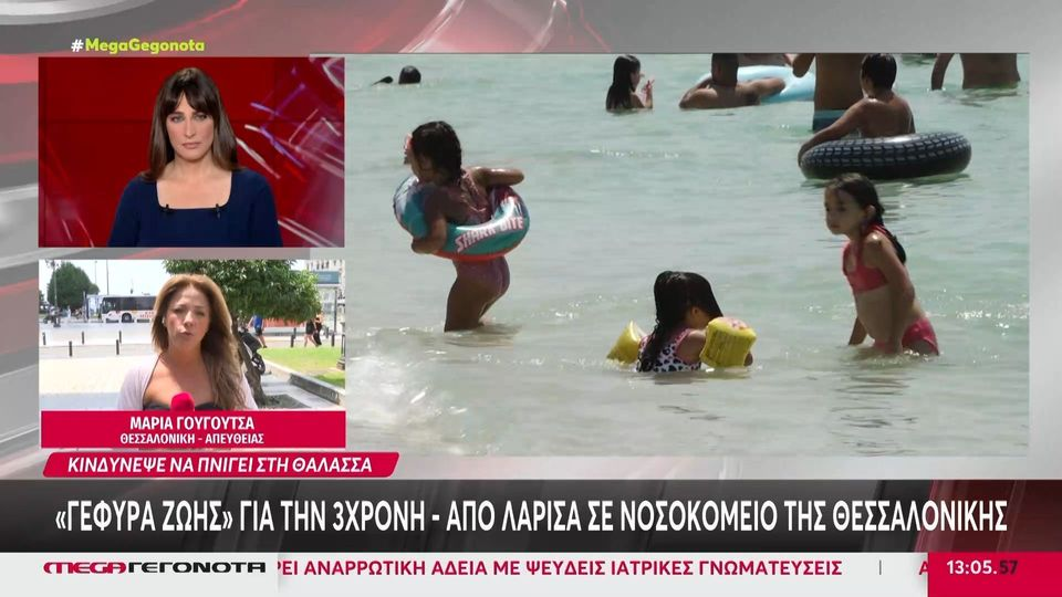 Η 3χρονη κινδύνεψε με πνιγμό όταν έκανε μπάνιο στην παραλία του τουριστικού θέρετρου των Μεσαγγάλων του δήμου Τεμπών. Σύμφωνα με τους γιατρούς, η κατάσταση της υγείας της είναι κρίσιμη αλλά σταθερή, όπως μεταδίδει το Mega.
