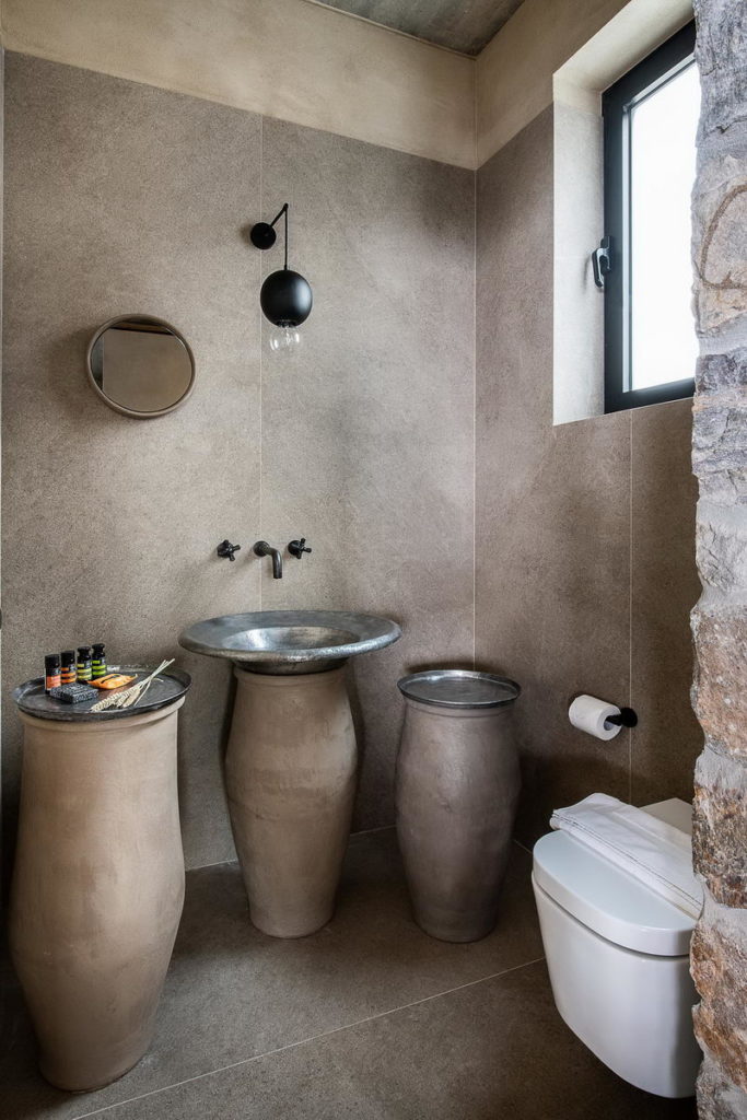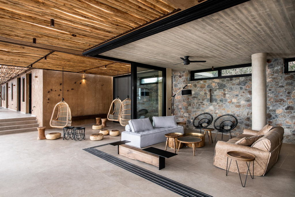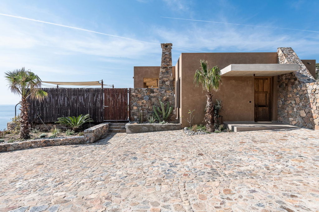 Το εμφανές μπετόν στις πλάκες, ο πηλός στο χρώμα του χώματος στους τοίχους εξωτερικά, το kourasanit στο χρώμα της άμμου στους εσωτερικούς τοίχους, τα σκουριασμένα μέταλλα, τα στραβά ξύλα στις πέργκολες και η φυσική πέτρα ξερολιθιάς, είναι τα βασικά υλικά της κατοικίας. Η φύτευση μοιάζει σαν συνέχεια του βουνού. Τέσσερα υπνοδωμάτια με εσωτερικό λουτρό, κουζίνα, τραπεζαρία, καθιστικό και wc σε ενιαίο χώρο, αποτελούν τους εσωτερικούς χώρους. Πέργκολες, πισίνα προσβάσιμη από όλους τους χώρους, υπαίθρια ψησταριά, εξωτερική τραπεζαρία και καθιστικό στην εξέδρα και στον προστατευμένο ημιυπαίθριο με τζάκι, συντελούν σε χαλαρή διαβίωση-διάλογο με τη φύση”.