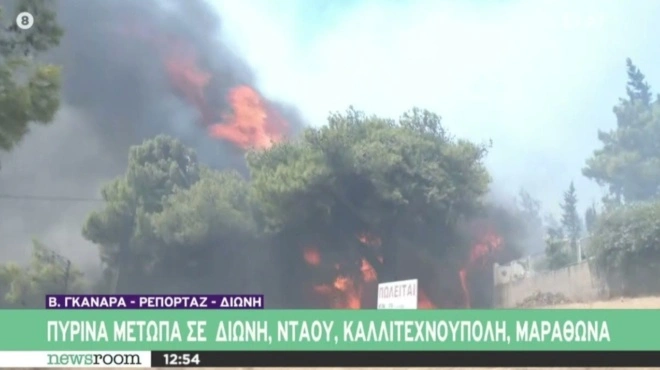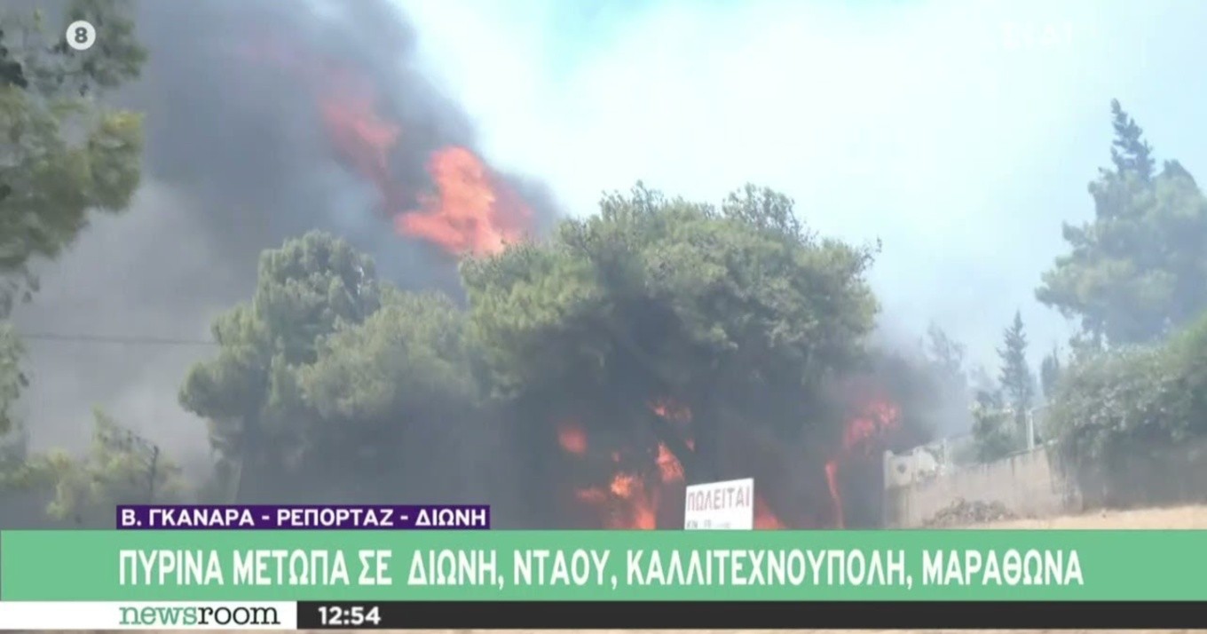 Η κατάσταση στη Διώνη είναι ανεξέλεγκτη και ένα από τα σπίτια παραδόθηκε στις φλόγες μπροστά στα μάτια της ρεπόρτερ του ΣΚΑΙ, Βάσιας Γκανάρα. Ένας πυροσβέστης ξεκίνησε να φωνάζει ότι πρέπει να απομακρυνθούν άμεσα από το σημείο γιατί καθώς η φωτιά εξαπλώθηκε παντού.