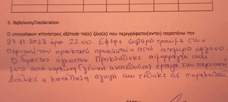 27.11.2023 ώρα 22.00. Έφερε σοβαρό τραύμα στην περιοχή του πρωκτού, προκληθέν από αιχμηρό όργανο.