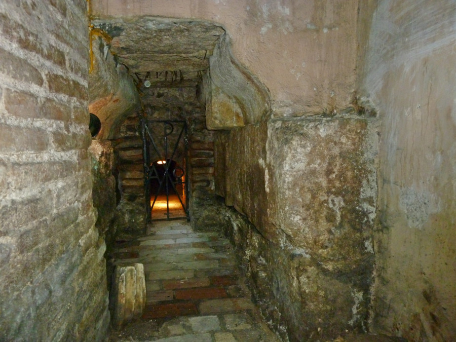 «Σώζονται κάποια τμήματα των αρχαίων ρωμαϊκών κτισμάτων, ενσωματώθηκαν στο υπόγειο της εκκλησίας και αποτέλεσαν έναν χώρο ο οποίος προέκυψε τμηματικά από ανασκαφές που έγιναν κατά τον 19ο αιώνα, από τον τότε υπεύθυνο του ναού, τον Αρχιμανδρίτη Αντωνίνο Καπούστιν. Είχε βρει υγρασία στο βάθος της εκκλησίας κι ήθελε να δει από πού προέρχεται.