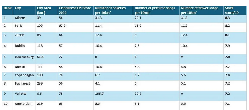 Μάλιστα όπως χαρακτηριστικά αναφέρει η έρευνα: «Πολυσύχναστες λαϊκές αγορές, άρωμα φρέσκων προϊόντων, βοτάνων και λαχταριστών ελληνικών λιχουδιών διαχέεται στον αέρα. Η Αθήνα είναι μια γιορτή για τις αισθήσεις, με 8,3 στα 10 στο μέτρο μυρωδιάς. Από την τραγανή τυρόπιτα μέχρι το σιροπιαστό γλυκό μπακλαβά, τα αρτοποιεία της πόλης προσφέρουν μια σοβαρή ικανοποίηση από μυρωδιές» και συνεχίζει: «Η Αθήνα είναι επίσης ένας λουλουδάτος παράδεισος, με 31 ανθοπωλεία και 22 αρωματοπωλεία ανά 10 τετραγωνικά χιλιόμετρα, πράγμα που σημαίνει ότι το ντελικάτο άρωμα απλώνεται σε κάθε γωνιά της πόλης. Η δέσμευση της πόλης για την καθαριότητα αντικατοπτρίζεται επίσης στον Δείκτη Περιβαλλοντικής Απόδοσης (EPI), με βαθμολογία 56,2. Επομένως, την επόμενη φορά που σχεδιάζετε ένα ταξίδι, μην ακολουθείτε την καρδιά σας – ακολουθήστε τη μύτη σας»