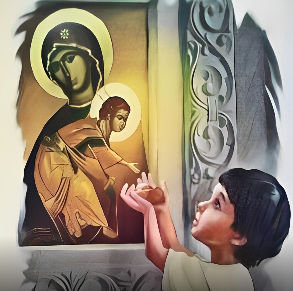 Έτρεξε γρήγορα στο παράθυρο και μ’ αυτά που είδε, γούρλωσαν τα μάτια του… Ο μικρός κουβέντιαζε με το βρέφος Ιησούς, που ευρίσκετο στην αγκαλιά της Θεοτόκου, στην εικόνα του Τέμπλου!